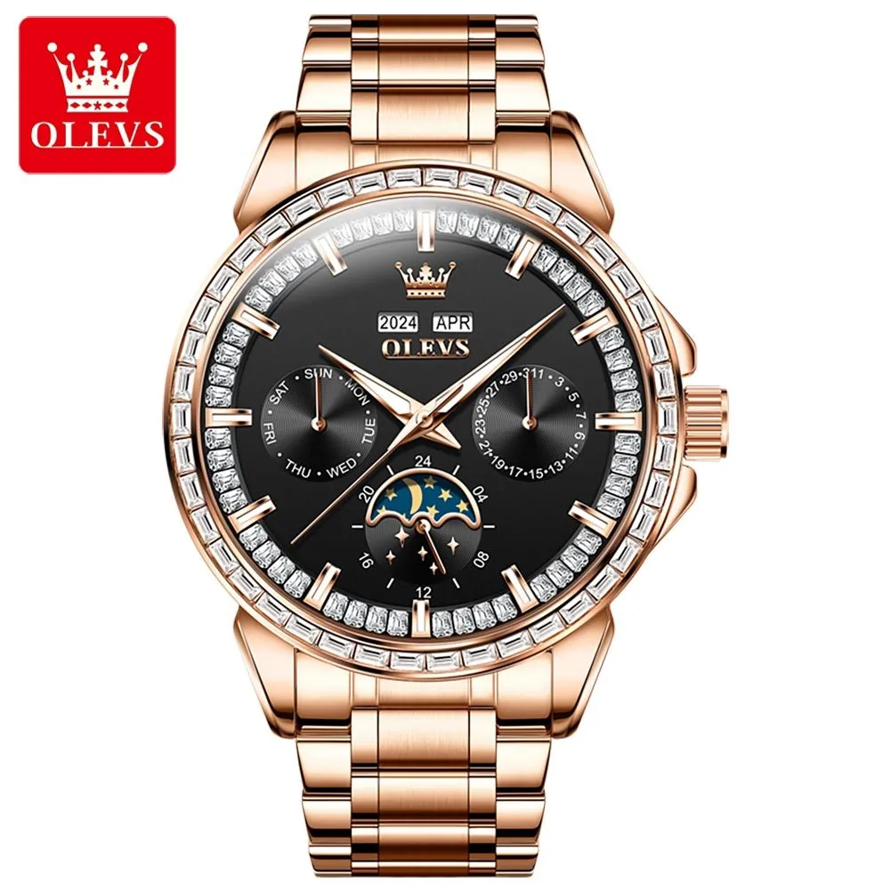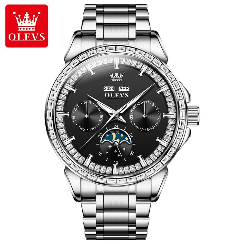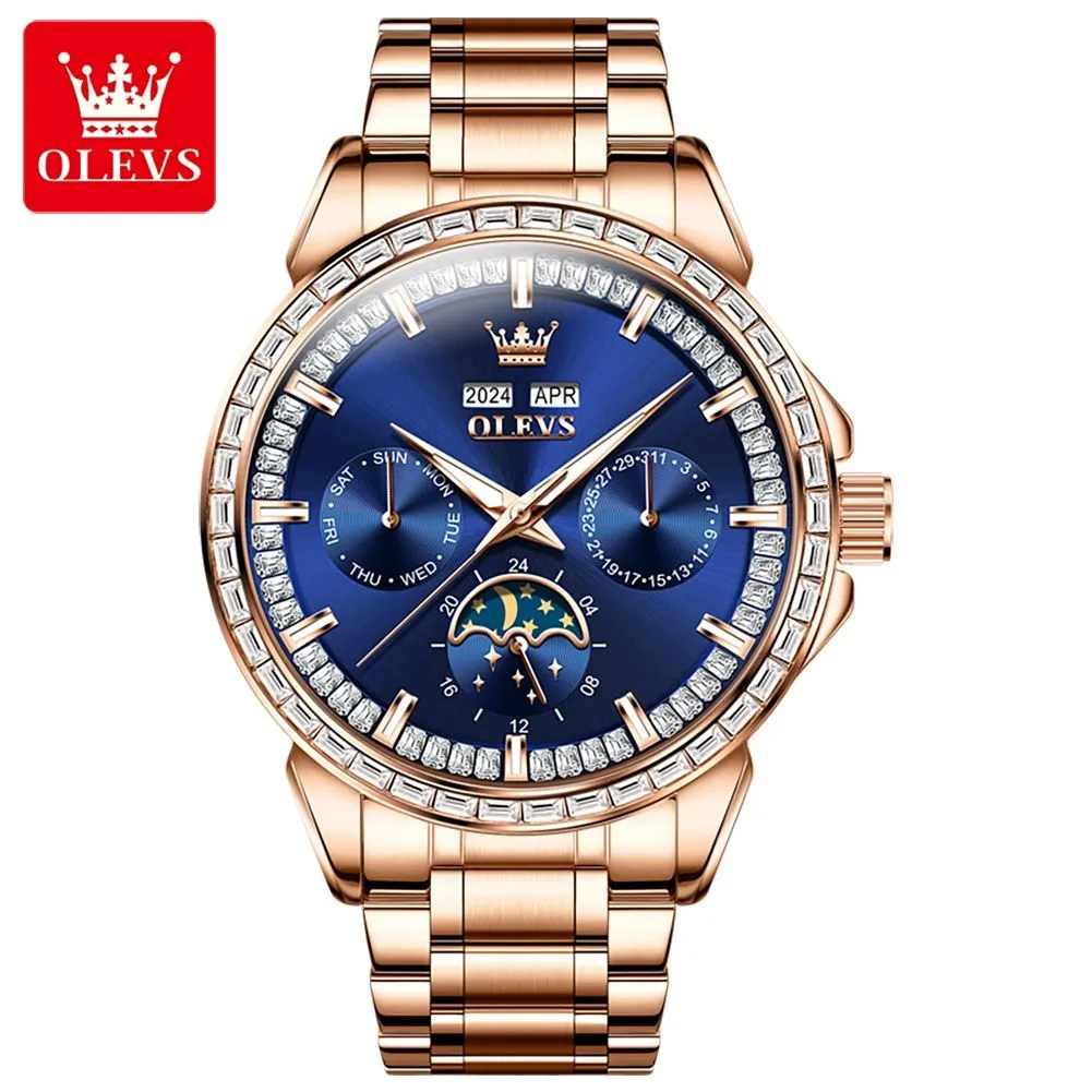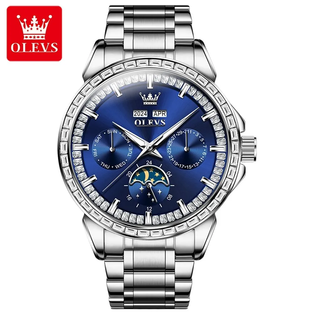 OLEVS 6695 NEW Men’s Watches Full Diamond Multifunctional Dial Blue Leather Strap Calendar Week Moon Phase Waterproof Wristwatch.
