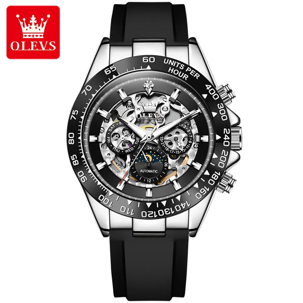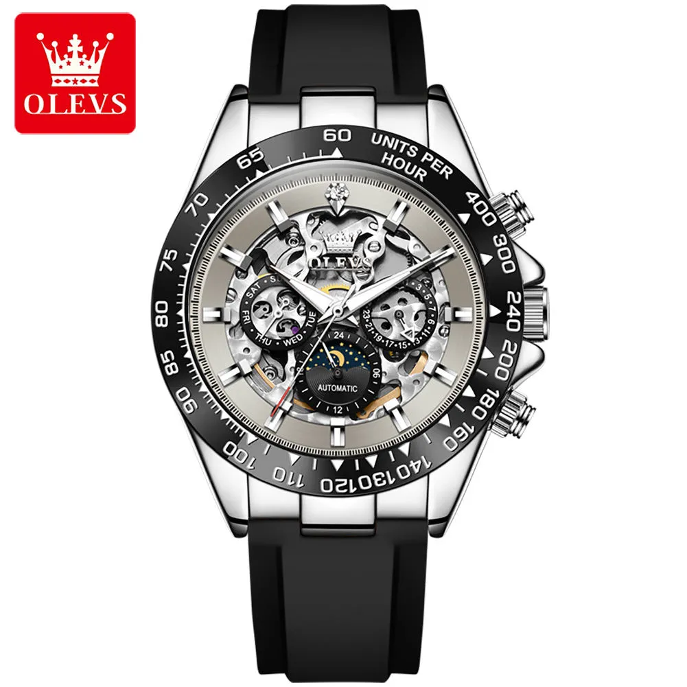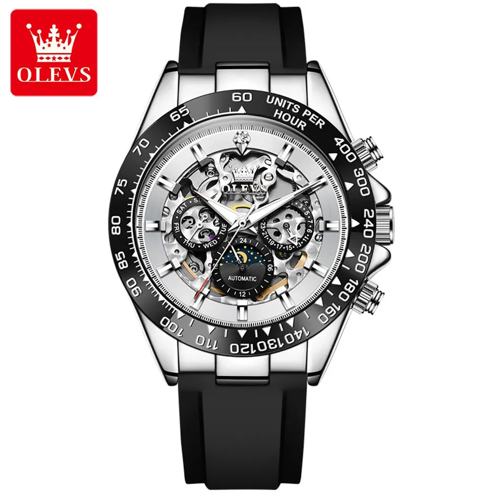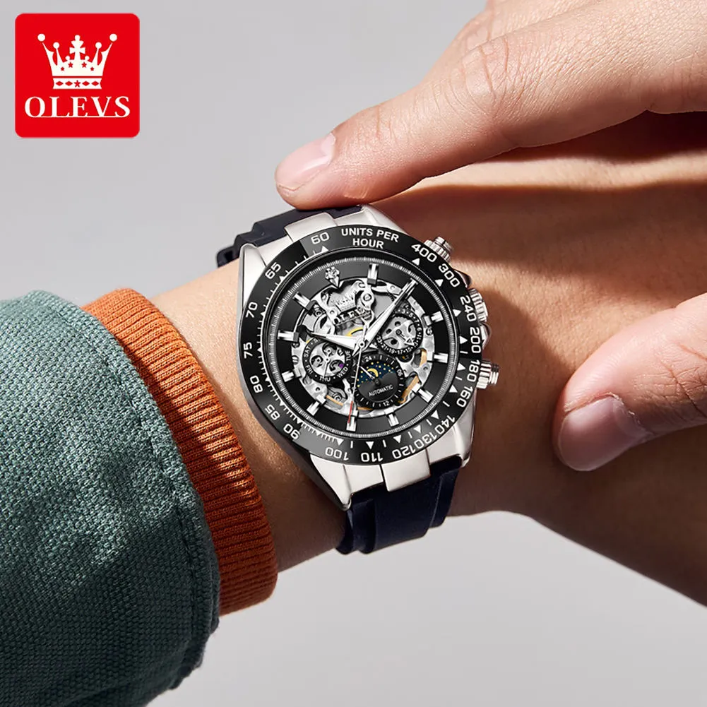 OLEVS Automatic Mechanical Men’s Watches Silicone Strap Hollowed Moon Phase Waterproof Luminous Calendar Luxury Man Watch 6713.