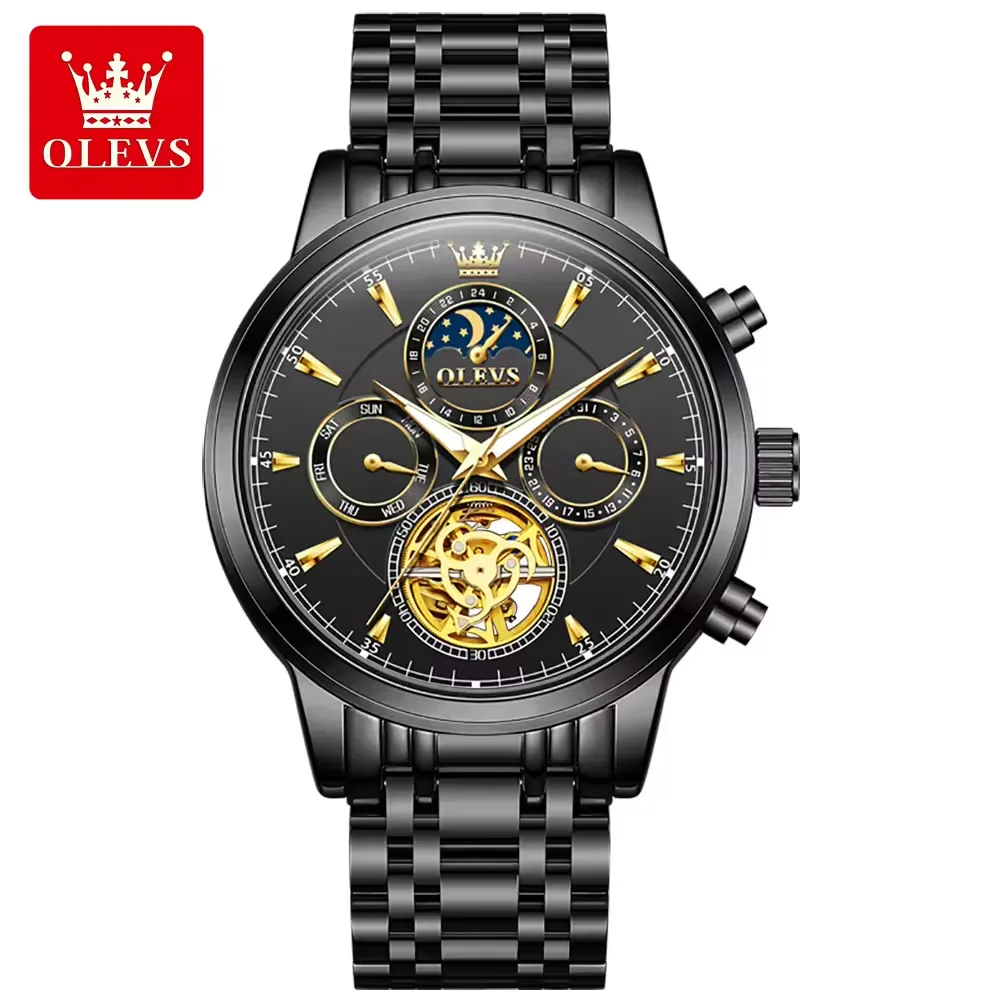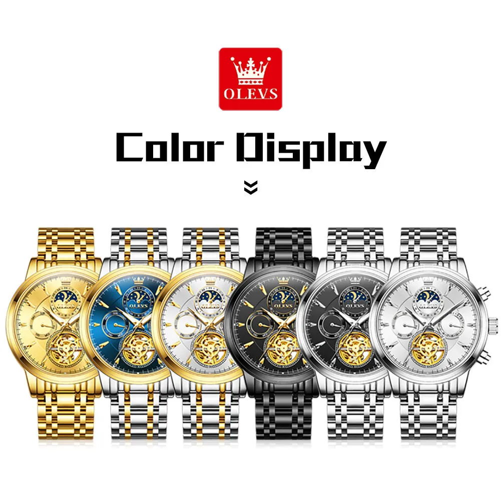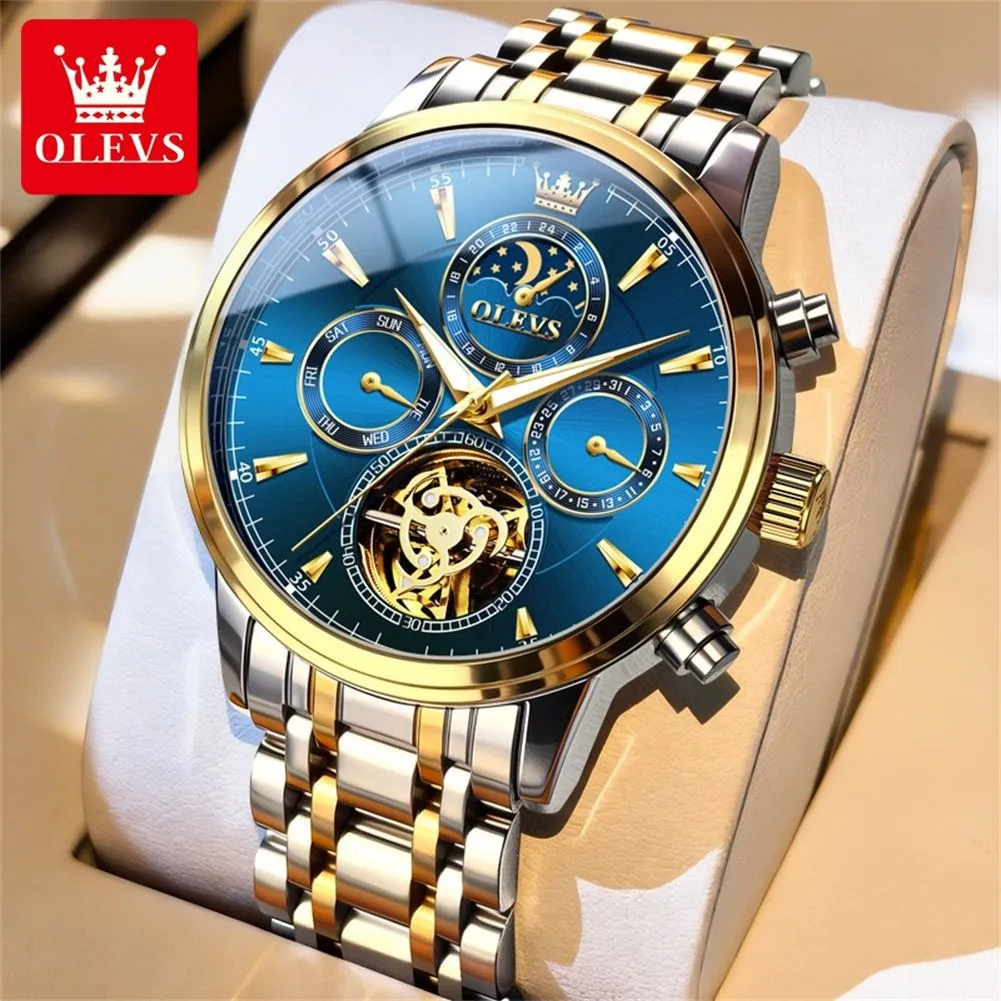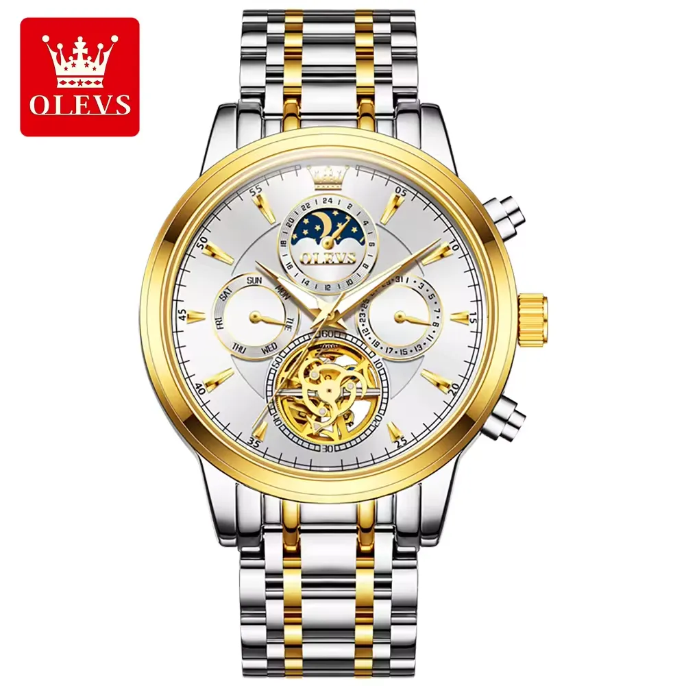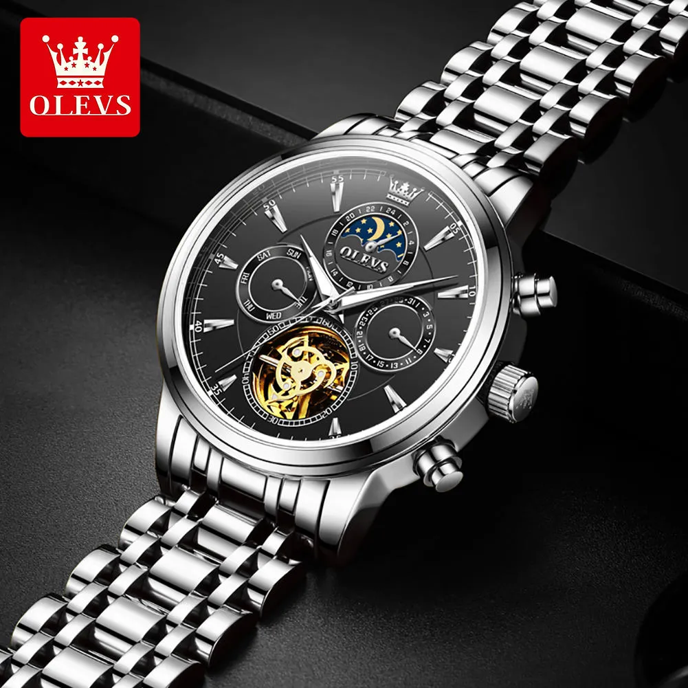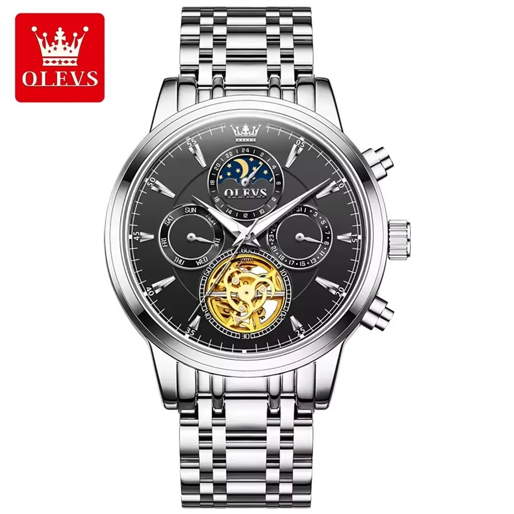 OLEVS 6746 Business Mechanical Movement Watch For Men Luminous Display 24h Moon Phase Stainless Steel 30M Waterproof Watch.